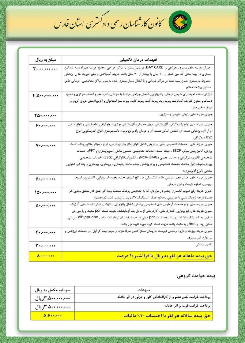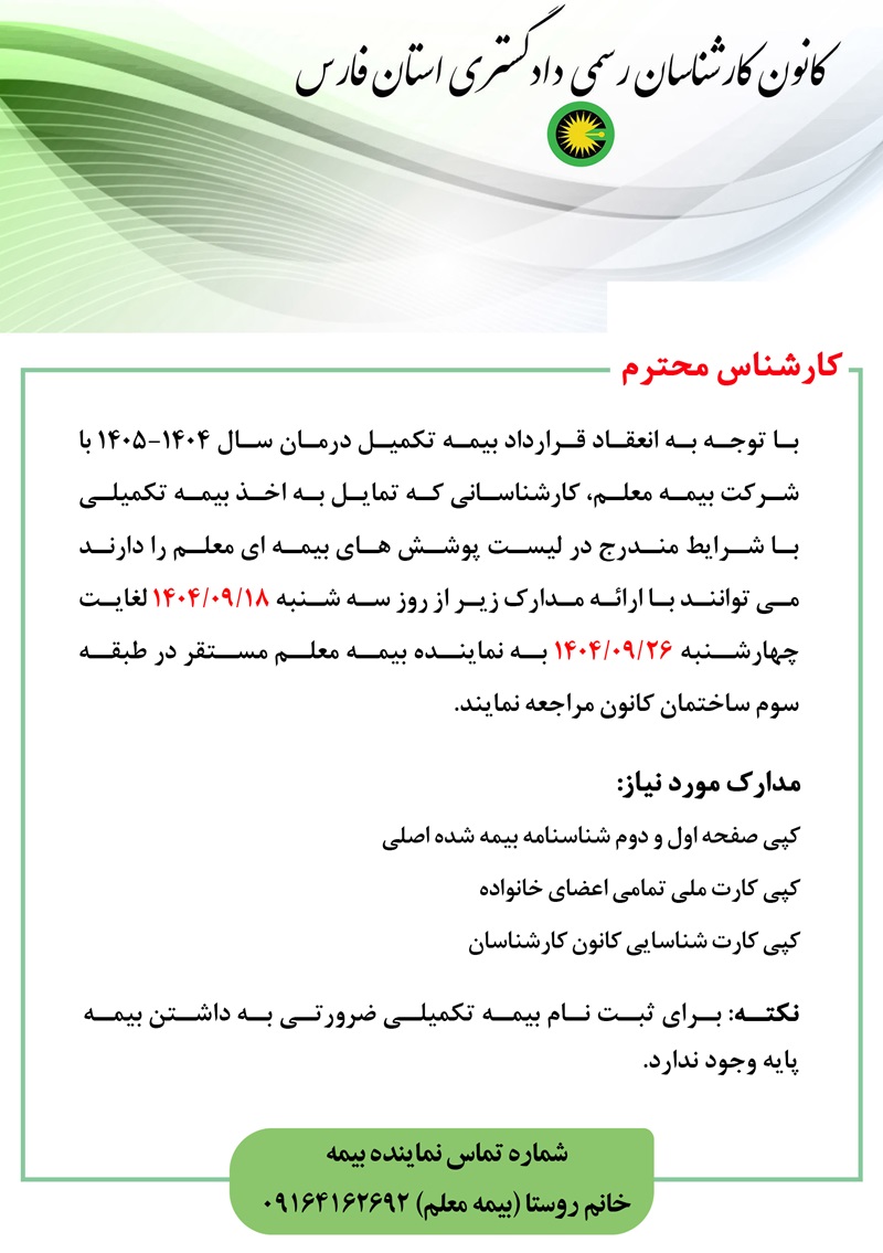 با توجه به انعقاد قرارداد بیمه تکمیل درمان سال 1404-1405 با شرکت بیمه معلم، کارشناسانی که تمایل به اخذ بیمه تکمیلی با شرایط مندرج در لیست پوشش های بیمه ای معلم را دارند می توانند با ارائه مدارک زیر از روز سه شنبه 1404/09/18 لغایت چهارشنبه 1404/09/26 به نماینده بیمه معلم مستقر در طبقه سوم ساختمان کانون مراجعه نمایند.