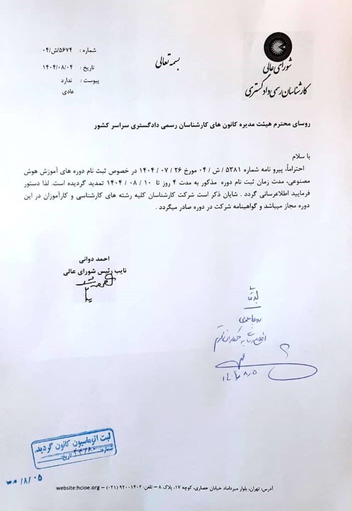 به اطلاع کلیه متقاضیان «دوره آشنایی با هوش مصنوعی و کاربرد آن در کارشناسی رسمی دادگستری» میرساند که مهلت ثبتنام این دوره تا روز شنبه، ۱۰ آبانماه ۱۴۰۴ تمدید شد.